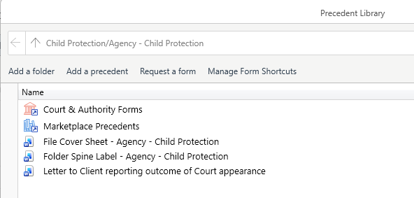 The Agency – Child Protection (VIC) matter provides access to the Child Protection (VIC) Precedent Profile with pre-set Precedent Library folders which include non-legally drafted precedents for everyday use, together with shortcuts to commonly used documents found under Court & Authority forms: