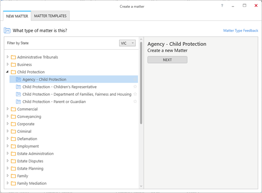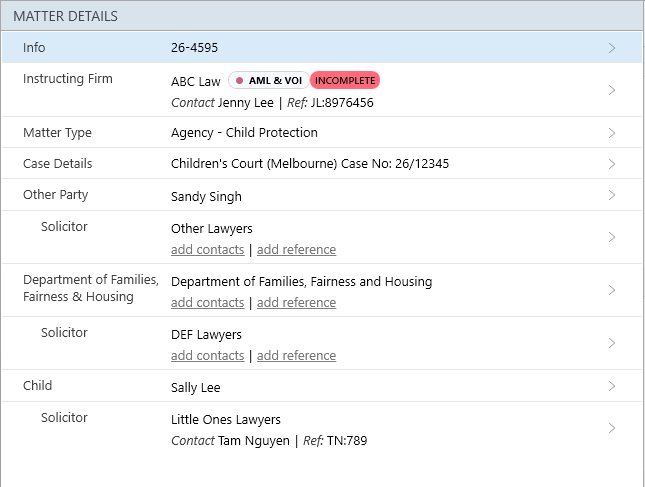 The Agency - Child Protection (VIC) matter type provides the necessary contact cards and layouts required to conduct an agency Child Protection matter on behalf of an instructing firm.