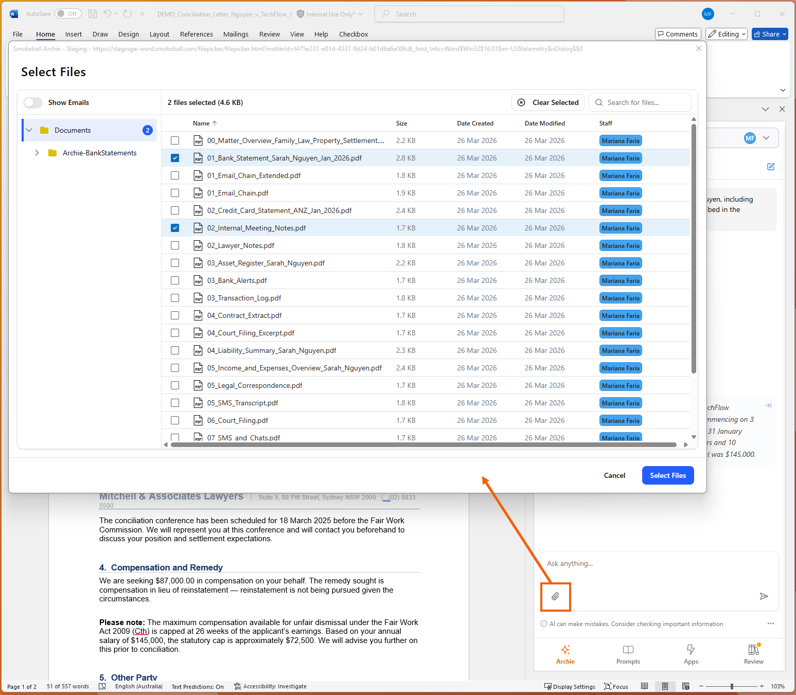 You can attach additional documents from the matter to help with providing additional context to Archie. Select the Paperclip icon and choose one or more files from your matter's documents list.