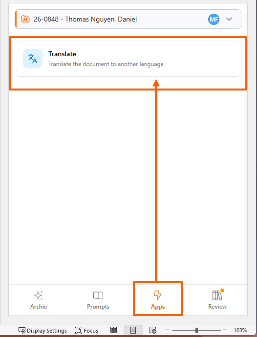 Select the Apps tab located on the bottom of the Archie panel to view and use apps that are connected to the Archie Word add-in.