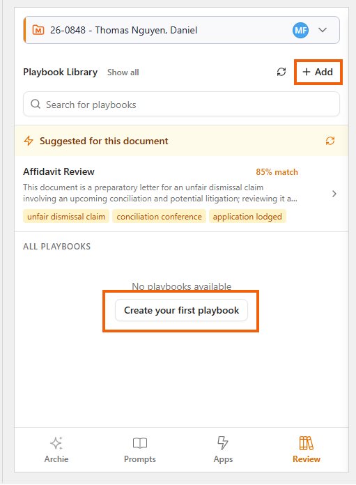 To run a Playbook, click on it from the Review tab. Archie will then start the document review based on your defined rules in the Playbook.
