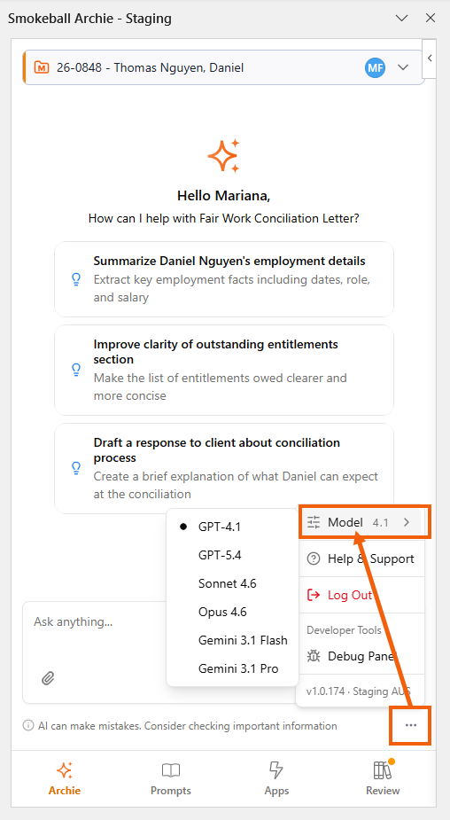 Select the Ellipsis icon under the chat text box to specify which AI model Archie should use.Â