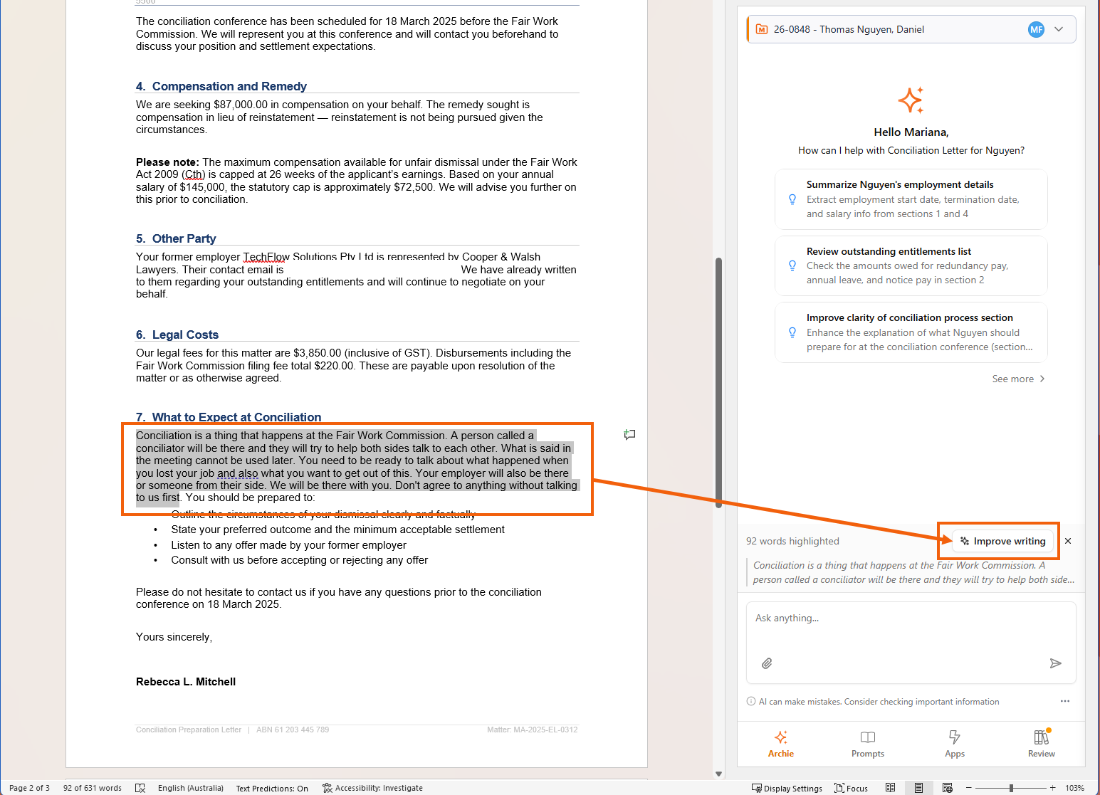 Description: If the compensation amount sought exceeds the 26-week earnings cap under the Fair Work Act, the letter must explicitly warn the client of this risk