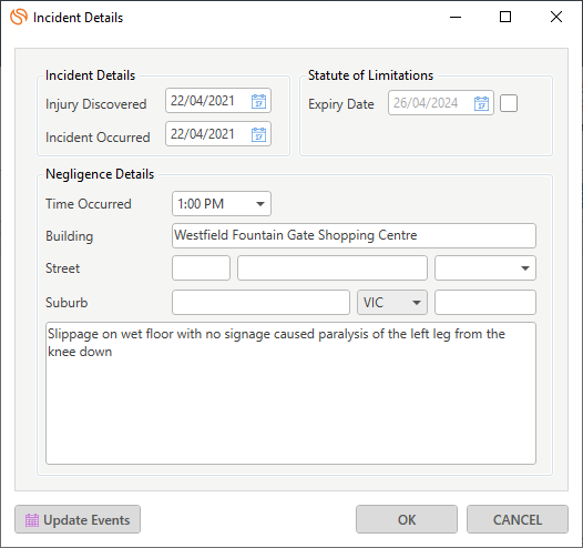 - Select 'Incident Details' to enter the Incident Occurred Date and the Injury Discovered Date. The Statute of Limitations Expiry Date will calculate for you here and can be added as an Event to the Calendar by clicking 'Create Events'