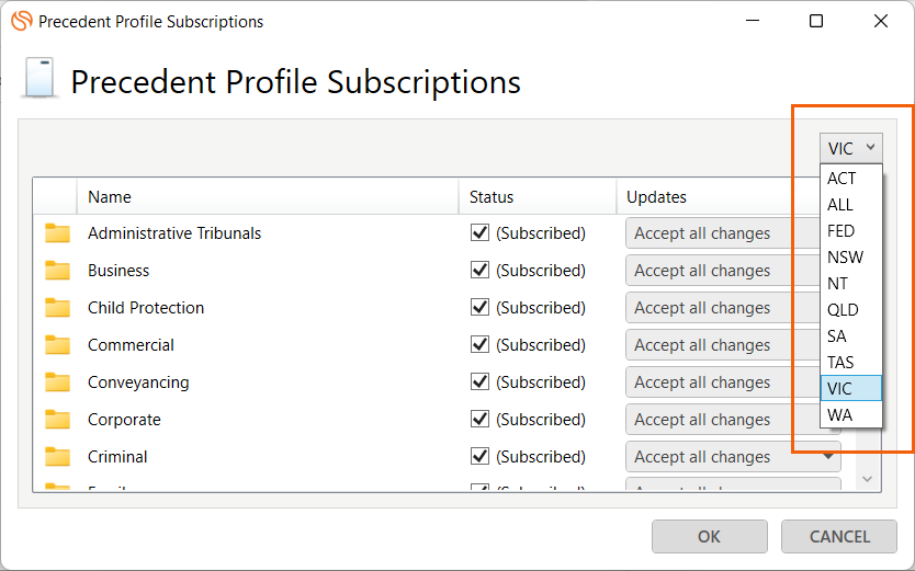 - Check that the relevant state is selected on the top-right corner of the Precedent Profile Subscriptions list.