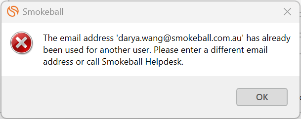 If the system picks up the conflict when you're setting up a new user profile, you will see the following error message come up.