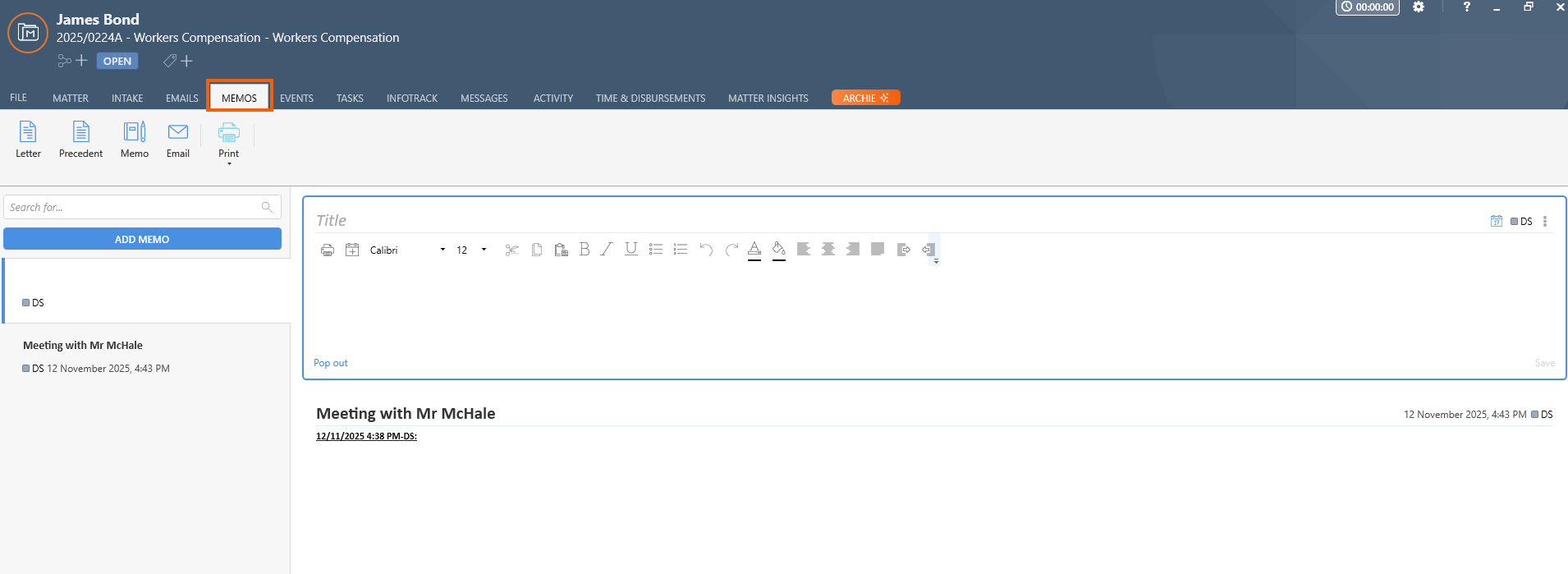 - Open a matter in Smokeball, then select Memo from the Matter tab.