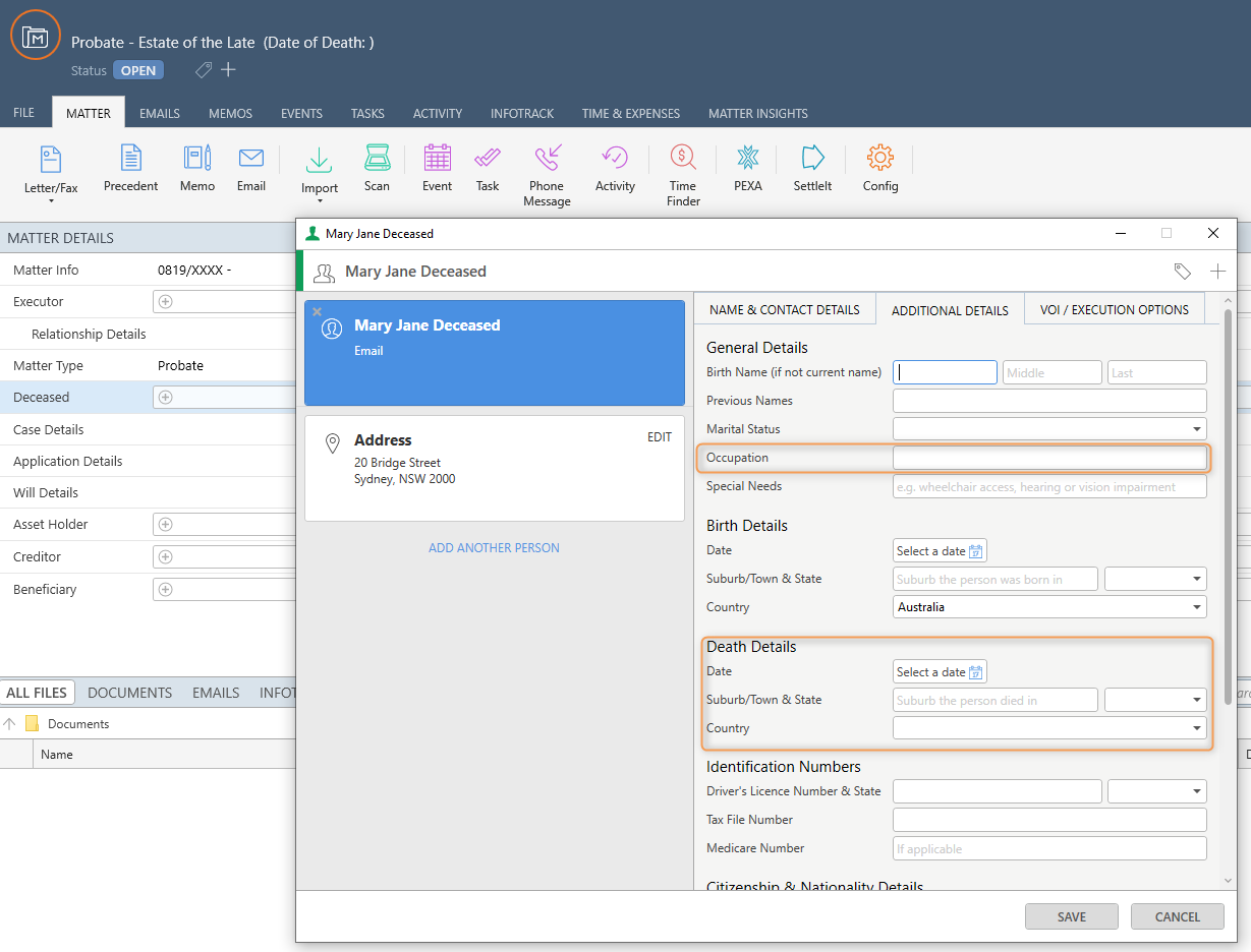 6. Go to Advanced view > Additional Details on the Deceased Card to enter the Occupation and Death Details