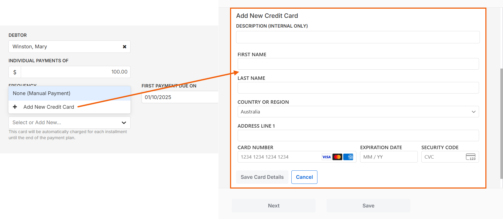 - Choose how the payment will be collected under the Payment Method drop-down menu. You can select either None (Manual Payment) or if Smokeball Payments is enabled, you can add/select a stored credit card from the list for Smokeball to automatically charge the client for each installment until the end of the payment plan.
