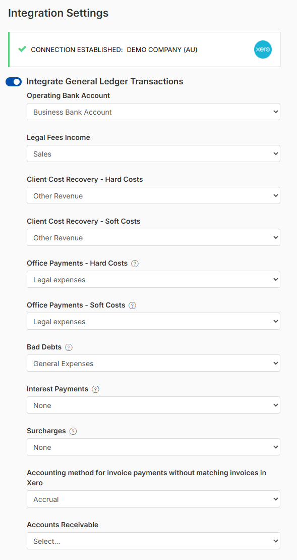 Update your mapping in Smokeball by selecting the new Xero accounts from the relevant drop-down menus. You do not need to disconnect Xero.