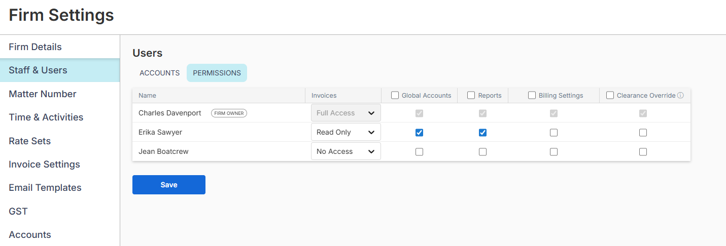 The Settings column allows you to restrict non-Firm Owner users from making changes in Smokeball Settings that affect the whole firm.