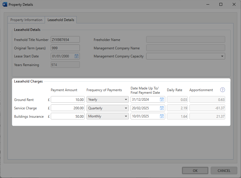 for each of the leasehold charges (Ground Rent, Service Charge and Buildings Insurance) to calculate the leasehold apportionments