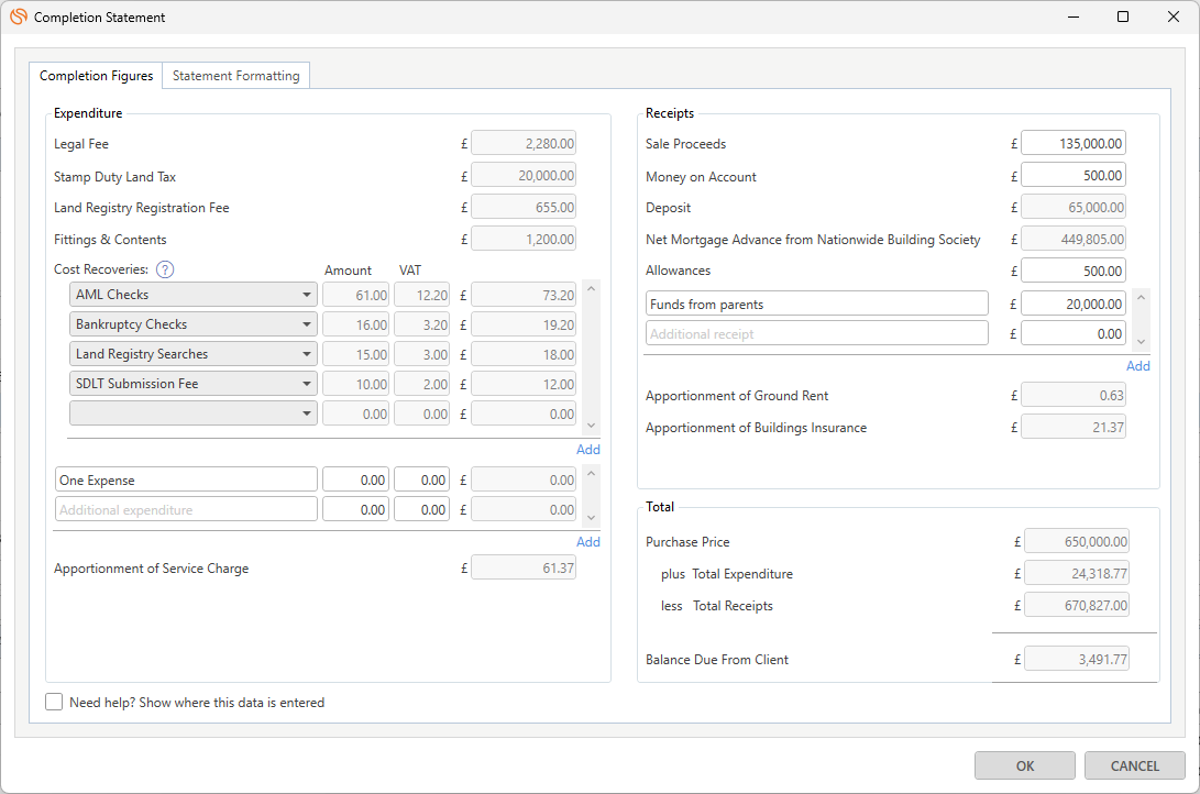 - Stamp Duty: Appears as a completion statement Expenditure.