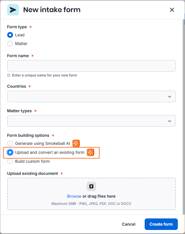 Alternatively, you can convert an existing paper form into a Smokeball intake form using AI.