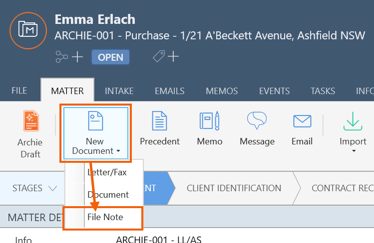 Learn how to create an Attendance Note document to record meetings, calls, or interactions with your client or a third party. Attendance Notes are stored alongside the other matter documents, differing from Memos which are saved separately in the Memos area of your matter.