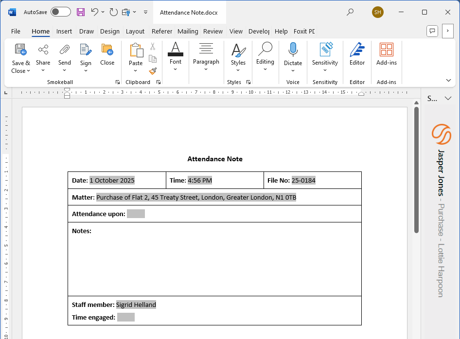 Smokeball provides a default Attendance Note template, but you can change it if you want to use your own: