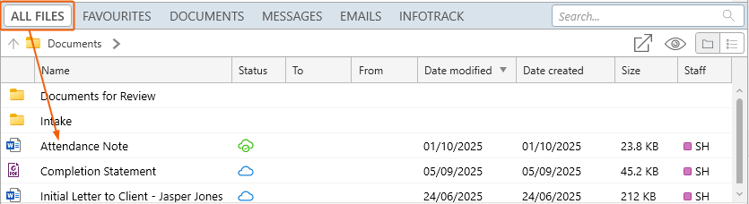 After saving the Attendance Note, you can find it in the All Files section at the bottom of the matter.Â