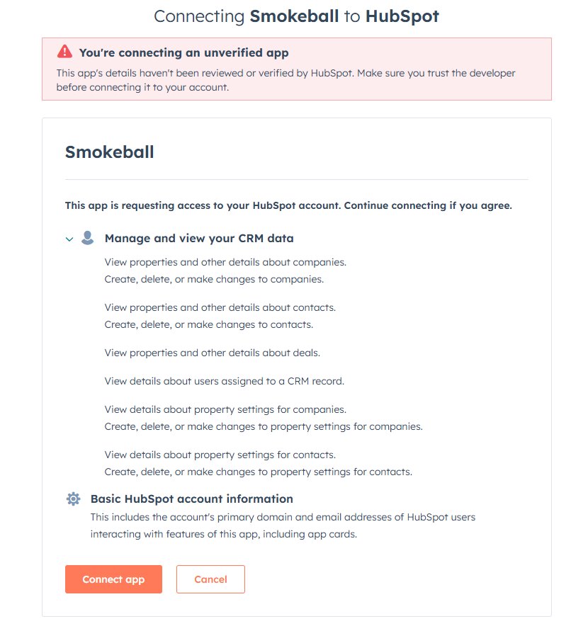 - Follow the prompts in HubSpot to connect Smokeball to HubSpot.