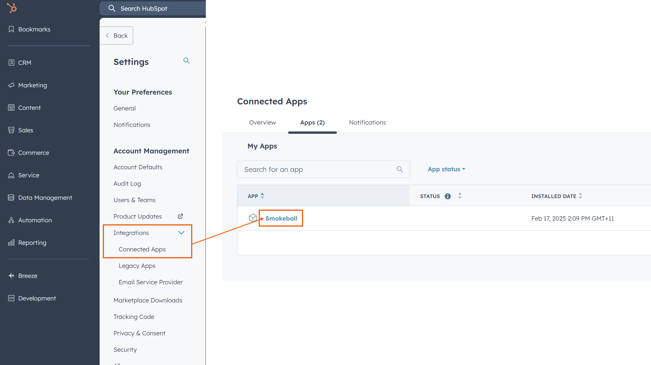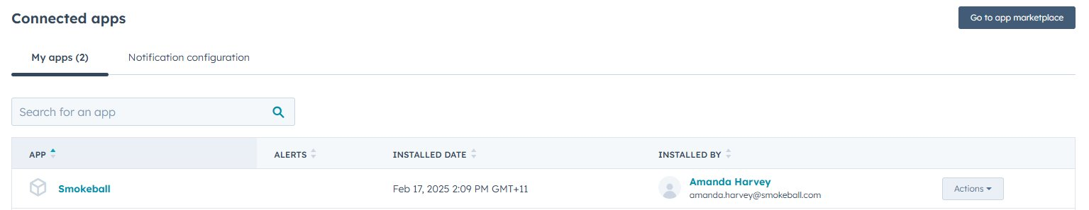 - Navigate back to Connected Apps in HubSpot settings. Smokeball should now be listed as an app.