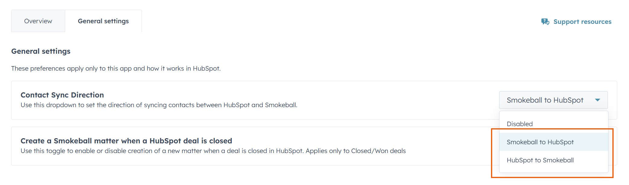 After connecting Smokeball to HubSpot, you must choose the sync direction from either: