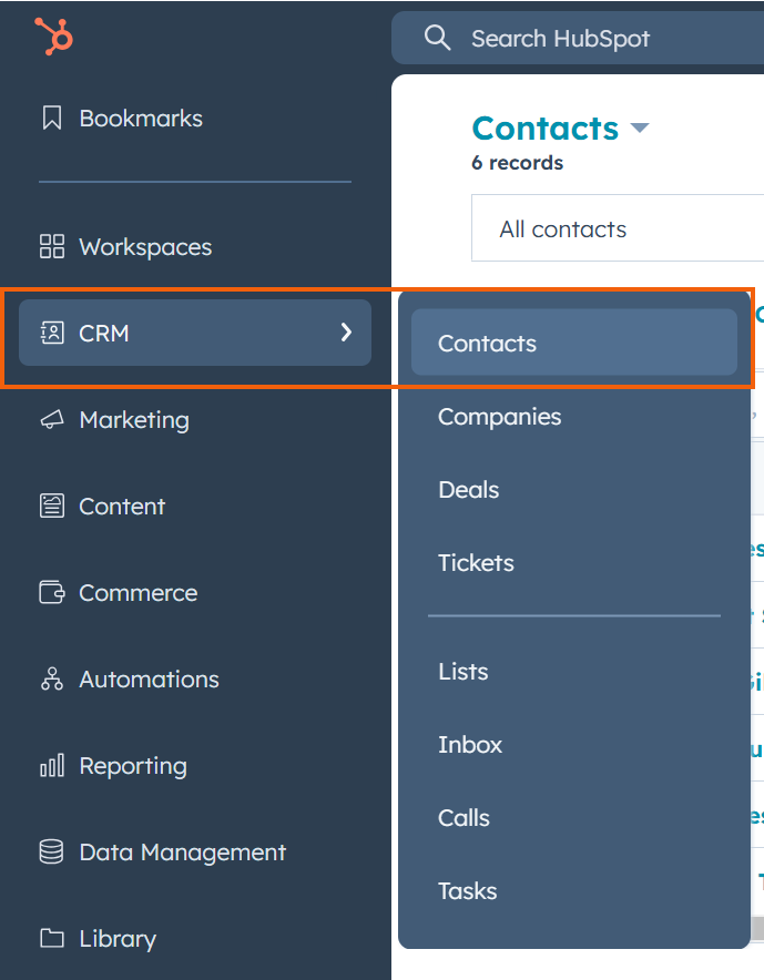 You can access your Smokeball contacts in HubSpot by selecting CRM from the left panel, then selecting Contacts.