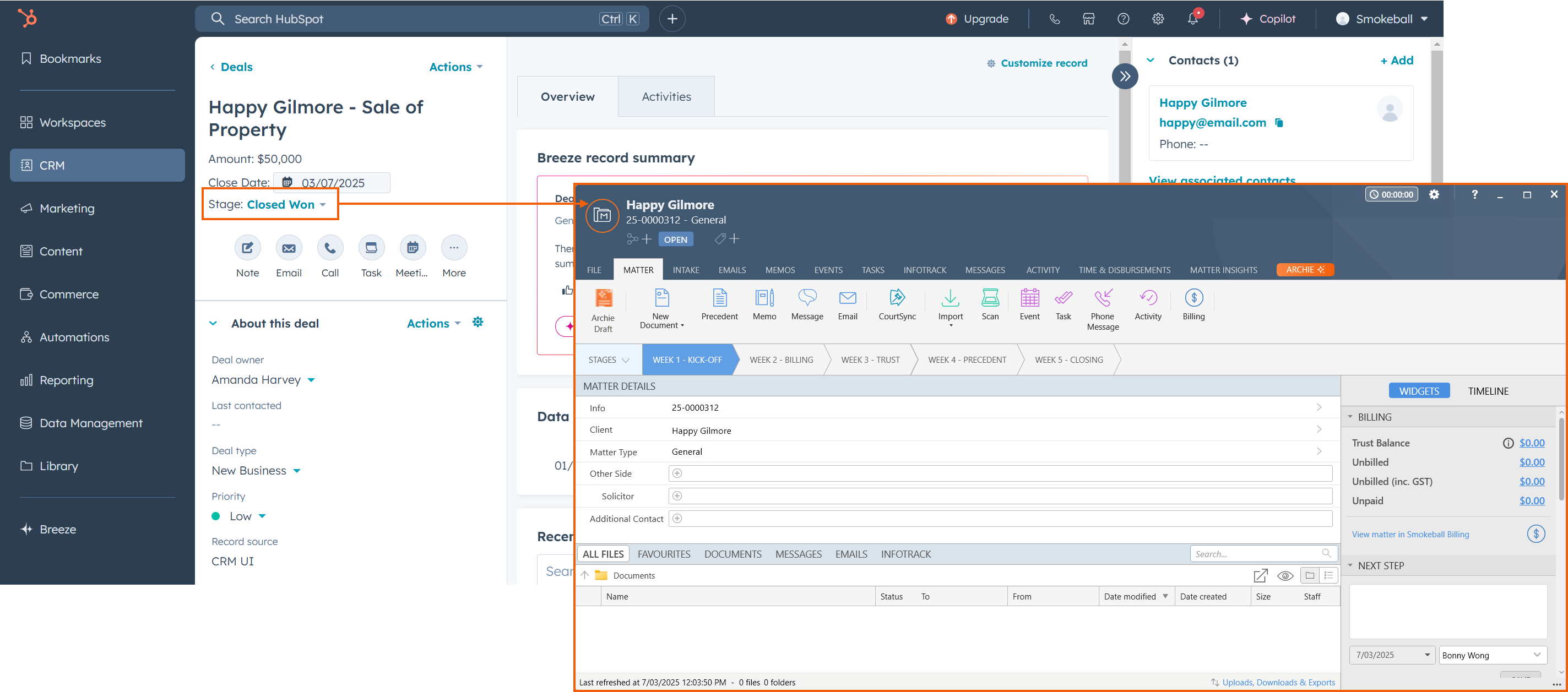 When a Deal transitions to the stage Closed Won, a new General matter will be created in Smokeball automatically.