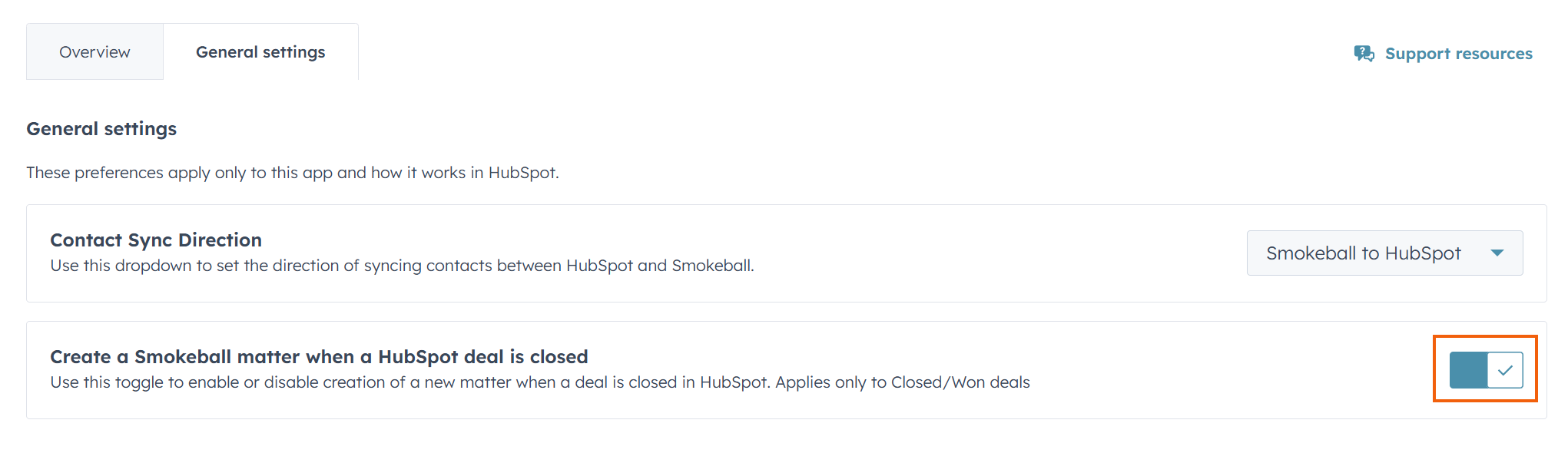 Toggle on/off the option to create a Smokeball matter when a HubSpot deal is closed.