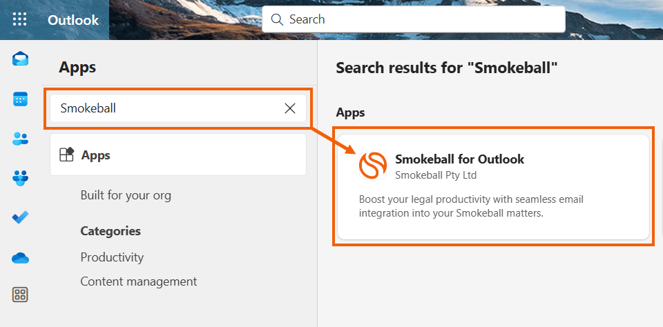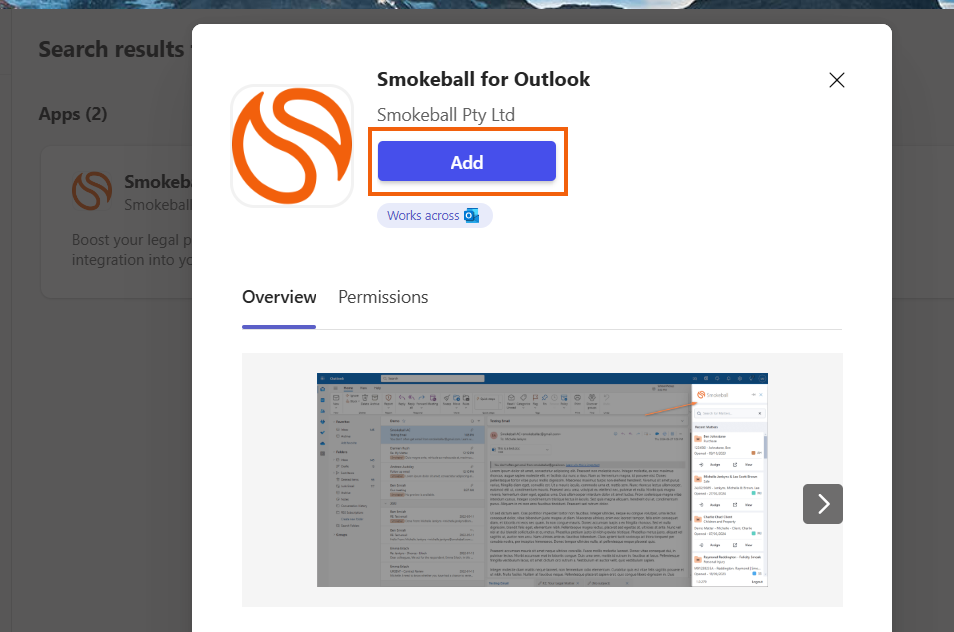 - Search for Smokeball in the search bar and click on "Smokeball for Outlook".