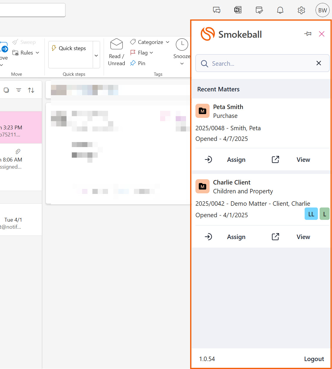 - Once you have logged in successfully, the Smokeball for Outlook toolbar will appear on the right-hand side. This is where your most recently worked on matters in Smokeball will appear.