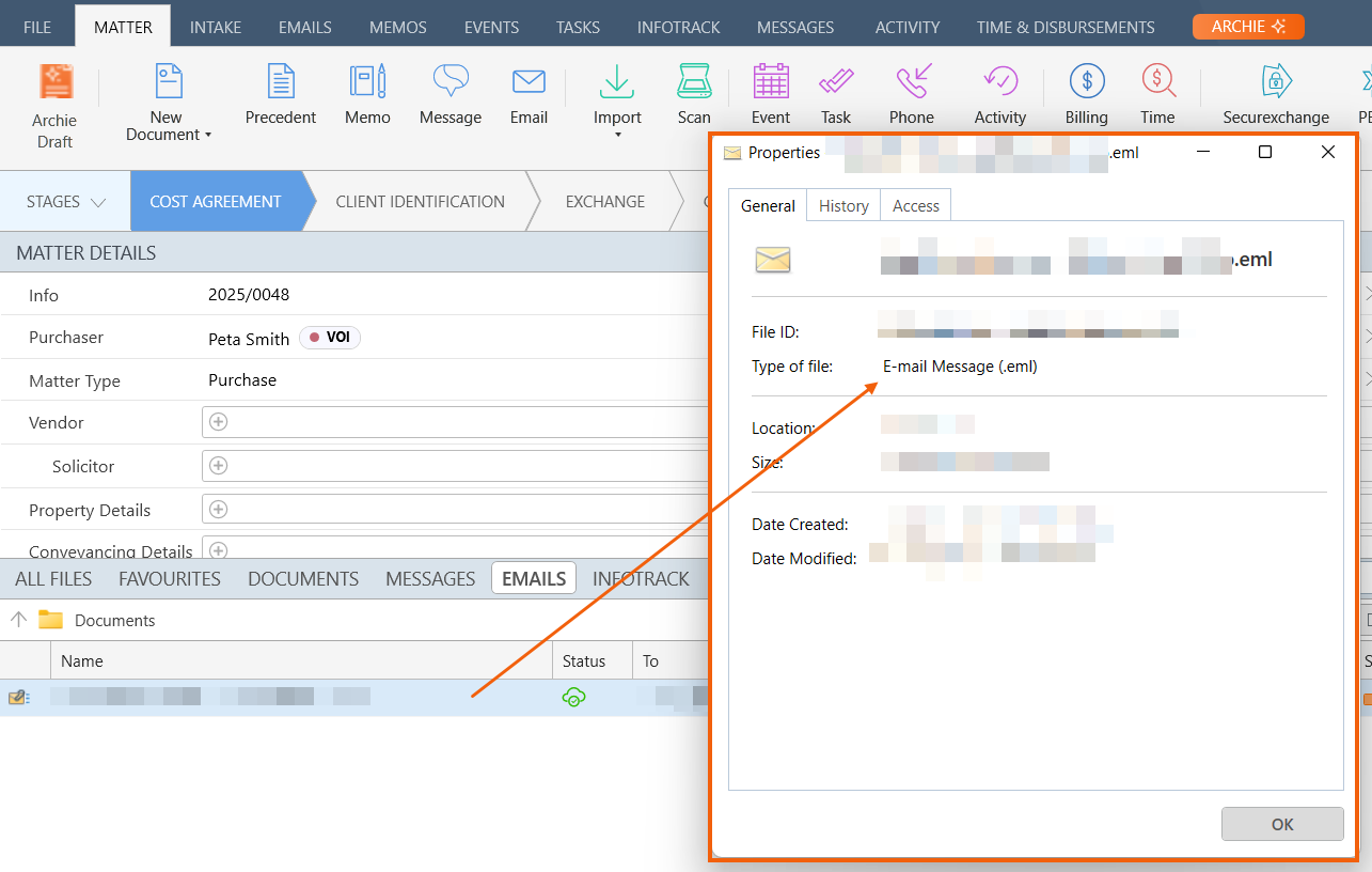 - Once assigned, the email will then appear in the Emails tab of the matter, as an .eml file.