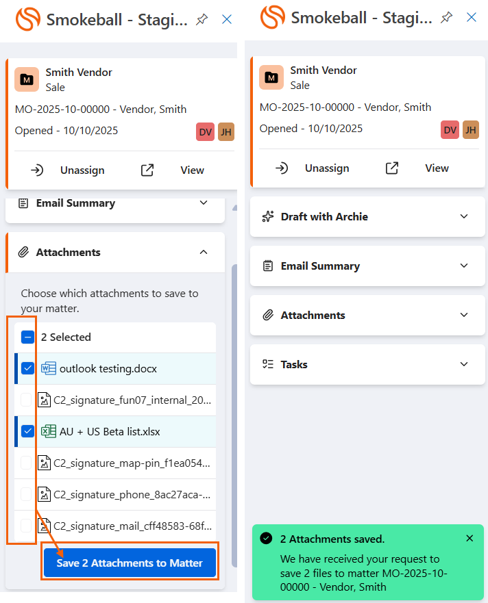 Once you have assigned an email to a matter, you can choose which attachments you wish to save to Smokeball. Select the Attachments section to view a list of all attachments. Then, tick the ones to save and select Save Attachments to Matter.