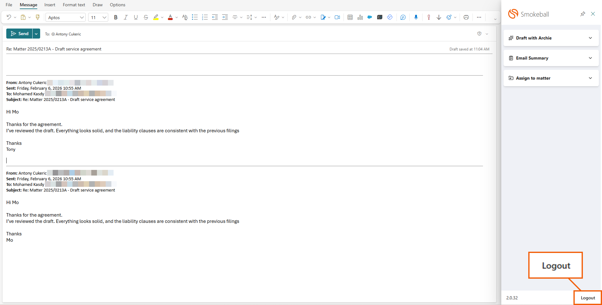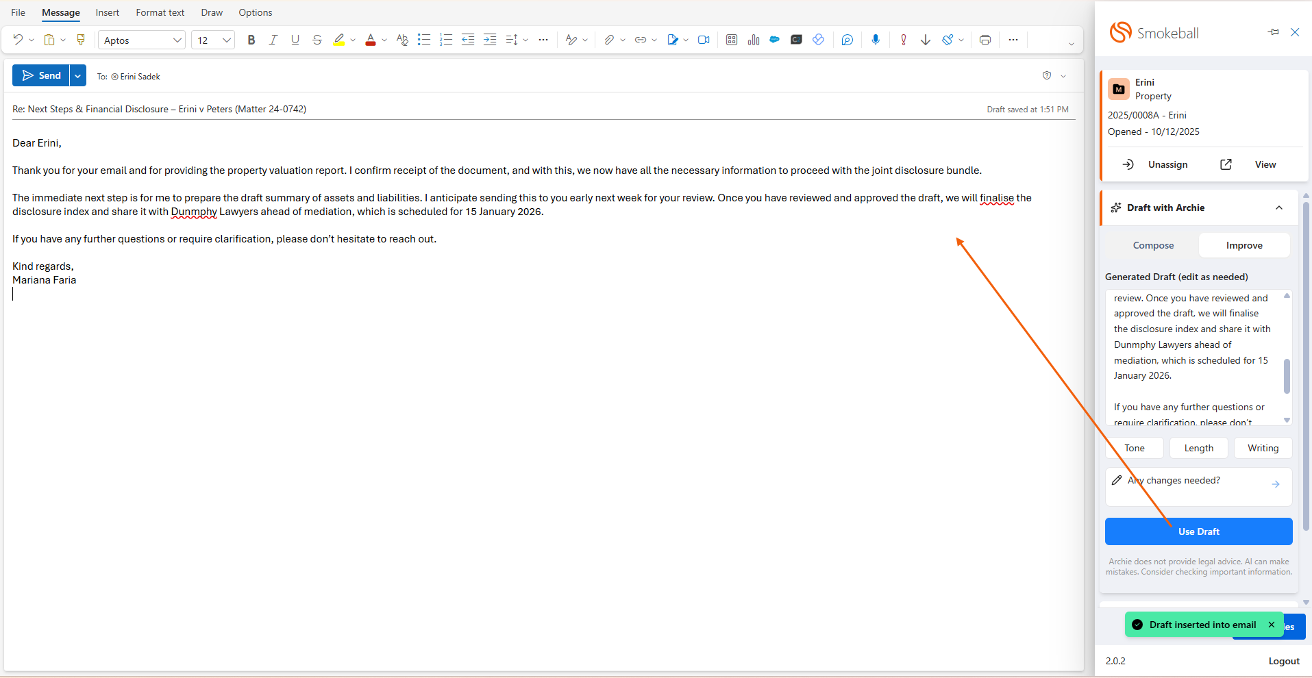 - If you have the Archie add-on, you can select a Rapid Reply or Draft with Archie from the Smokeball toolbar.