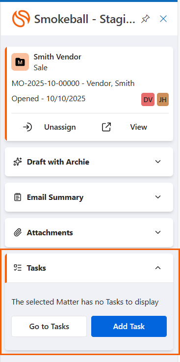 The Tasks section in the Smokeball toolbar shows the top six upcoming tasks related to the matter. From this screen, you can also add a new task: