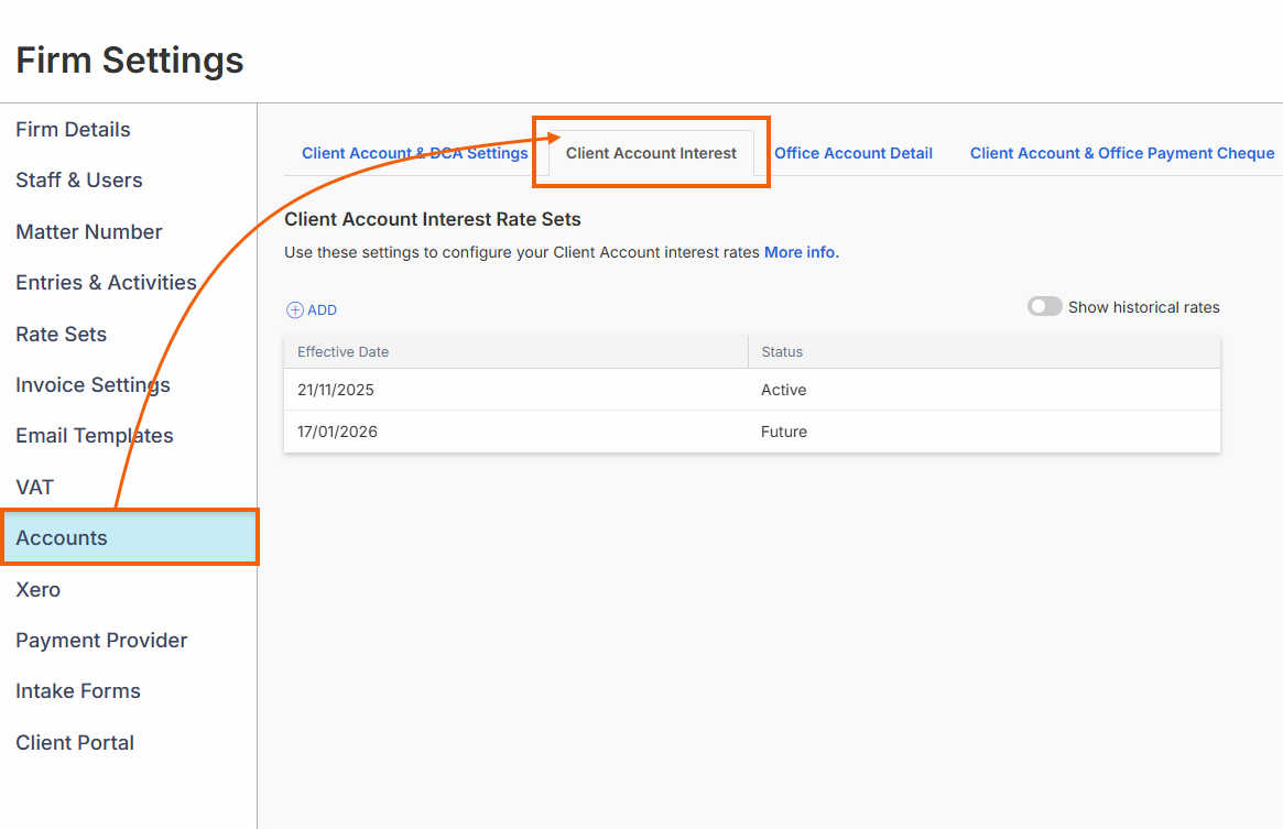 Before you begin, you should set up your firm's client account interest rates. To do this: