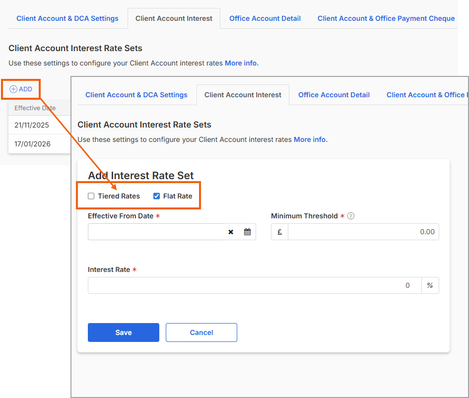 Flat Rate - this is a single interest rate percentage that applies to all client balances, regardless of amount or deposit date.