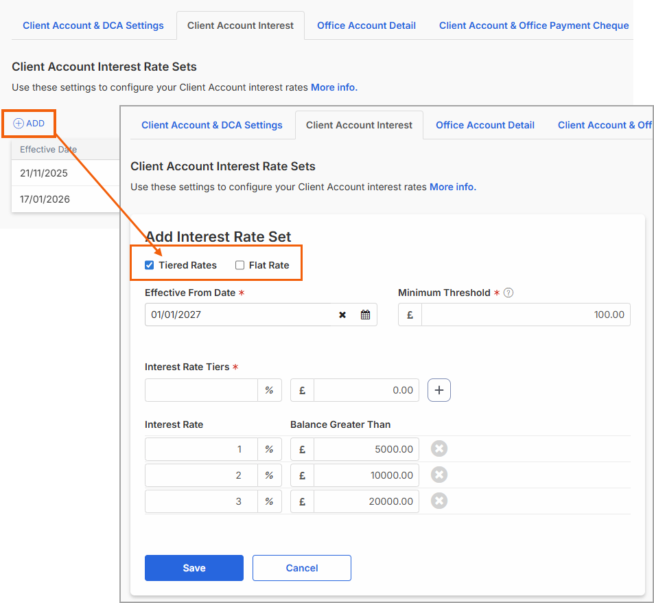 Tiered Rate - this option allows you to define multiple amount-based tiers. Each tier must have a corresponding interest rate and applicable balance, with balance being the individual balance held on each matter, NOT the overall client account balance. Example tiers could be: