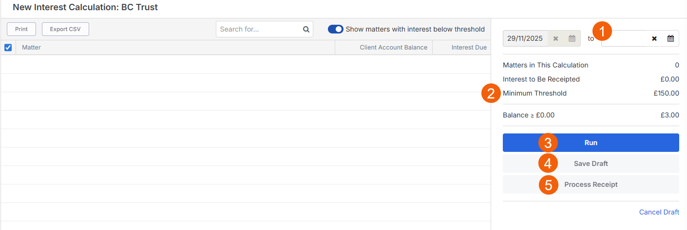 If your firm has an approval process before processing interest receipts, utilise the Save Draft button above Process Receipt, or Print or Export CSV on the top-left corner of the data to work on it further. The printout contains signature blocks for the purpose of approvals.