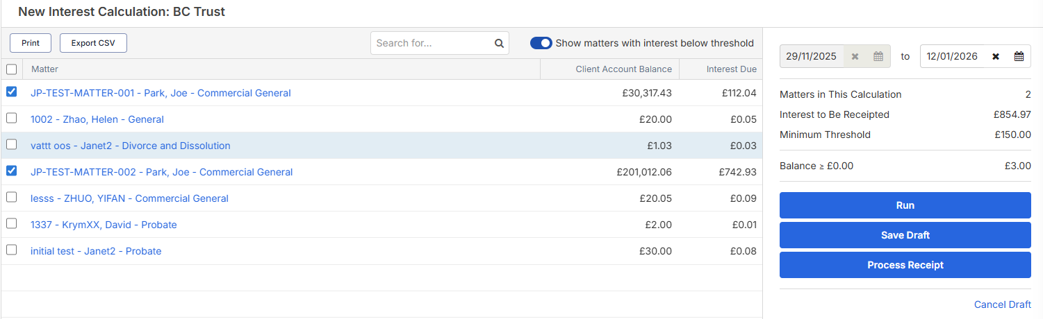 - The matters with interest due below the below your minimum threshold will be displayed but will not be automatically ticked. You can tick them manually to include them in the receipt.