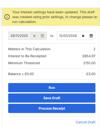 - The system calculates interest based on the balance held on the matter and the duration the balance has been held.
