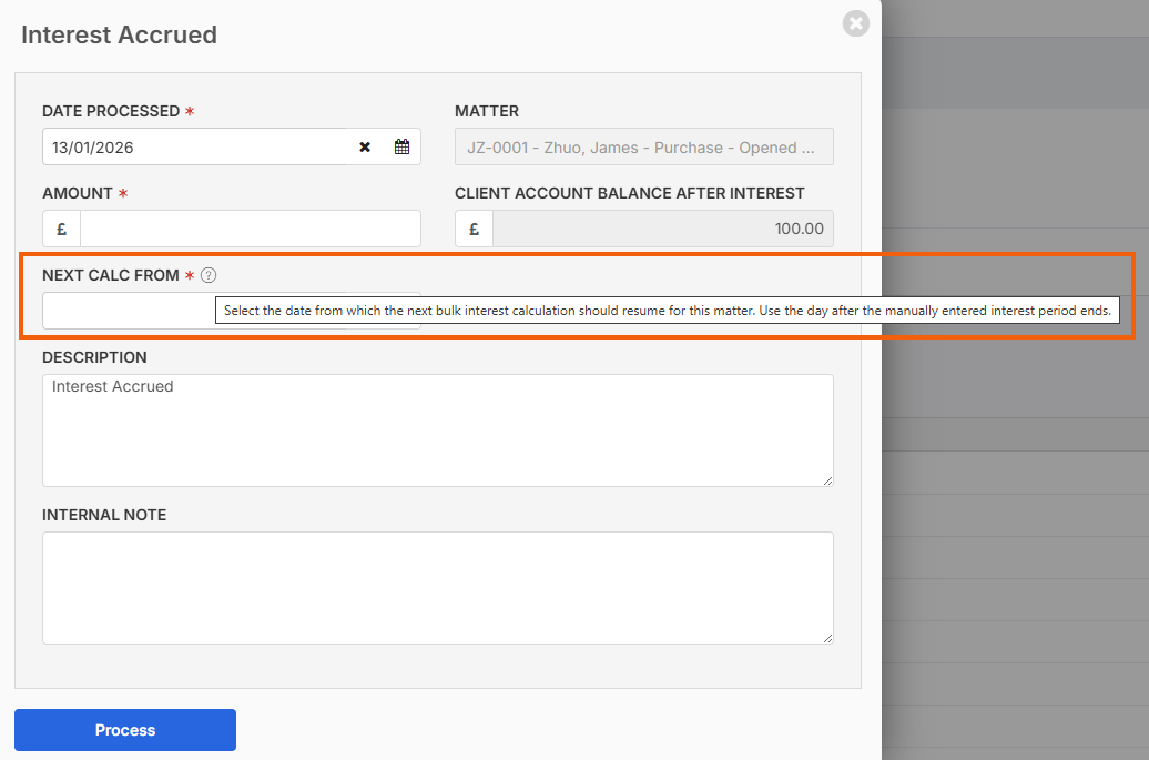 To manually add interest to a matter, receipt interest in the same way as before. However now you are required to enter a date when the Interest Calculator should next pick up this matter and include it in future bulk interest calculations.