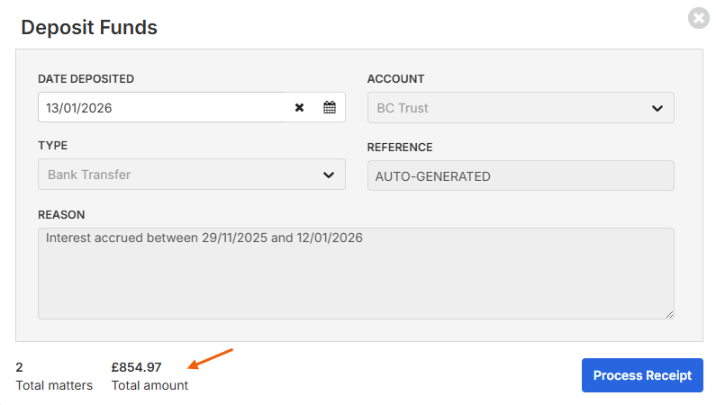 When you are ready to process the interest and receipt the interest amounts to the selected matters, click Process Receipt. A final screen will appear which displays the total matter and amount to be processed.