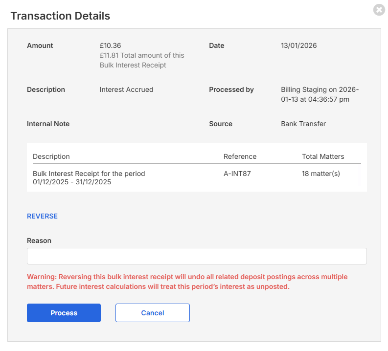 Reversals apply to all related interest deposits across all matters. They include the total receipt amount and number of affected matters. A reason is also required when reversing.