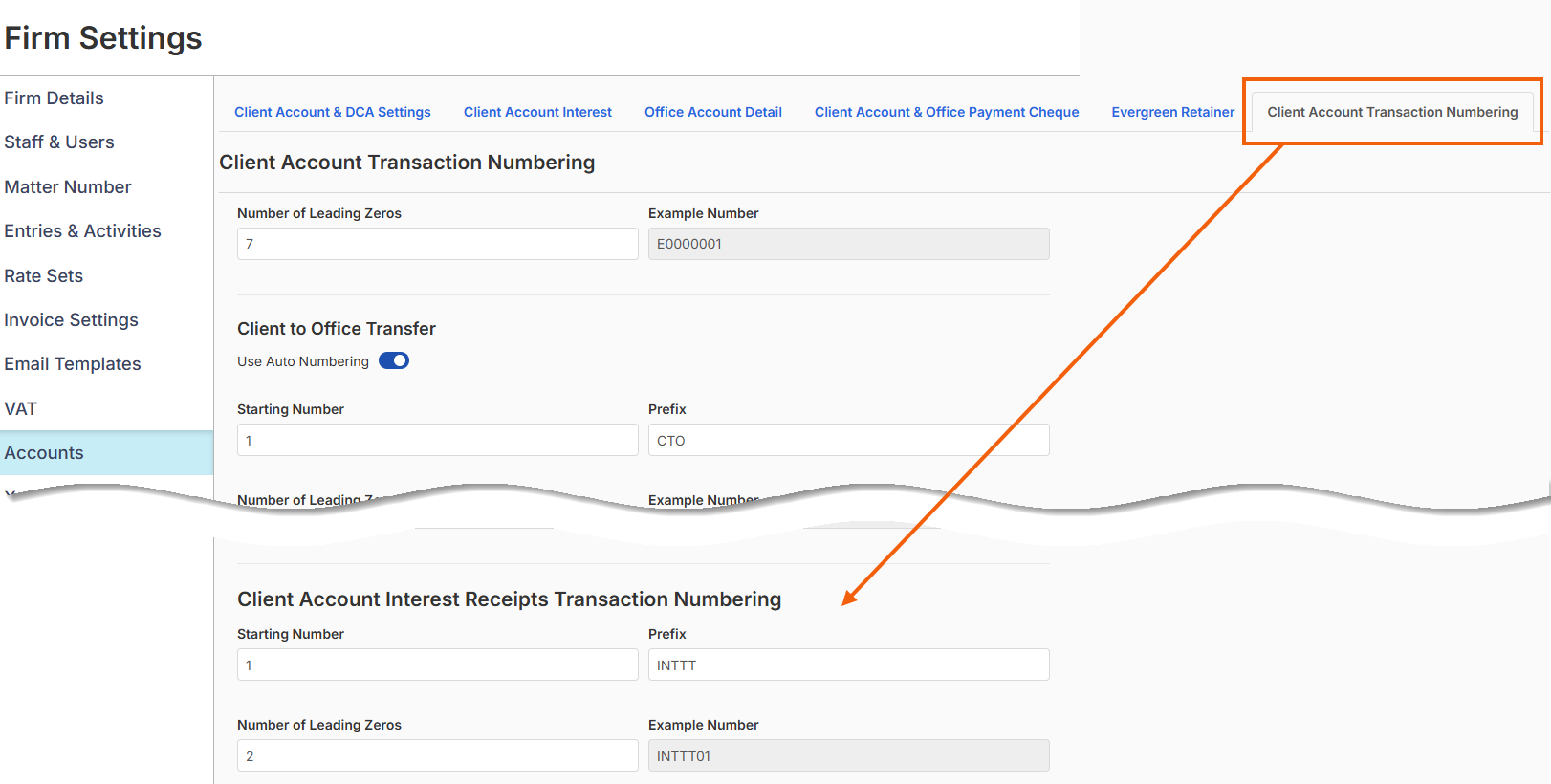 - Select Accounts from the left menu, then select the Client Account Transaction Numbering tab.