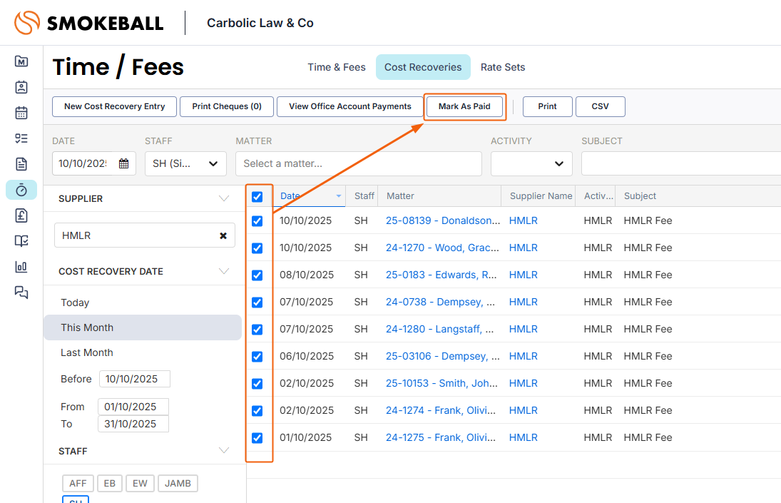 To streamline the payment reconciliation process when handling high volumes of cost recoveries, you can mark multiple entries as paid in bulk.Â