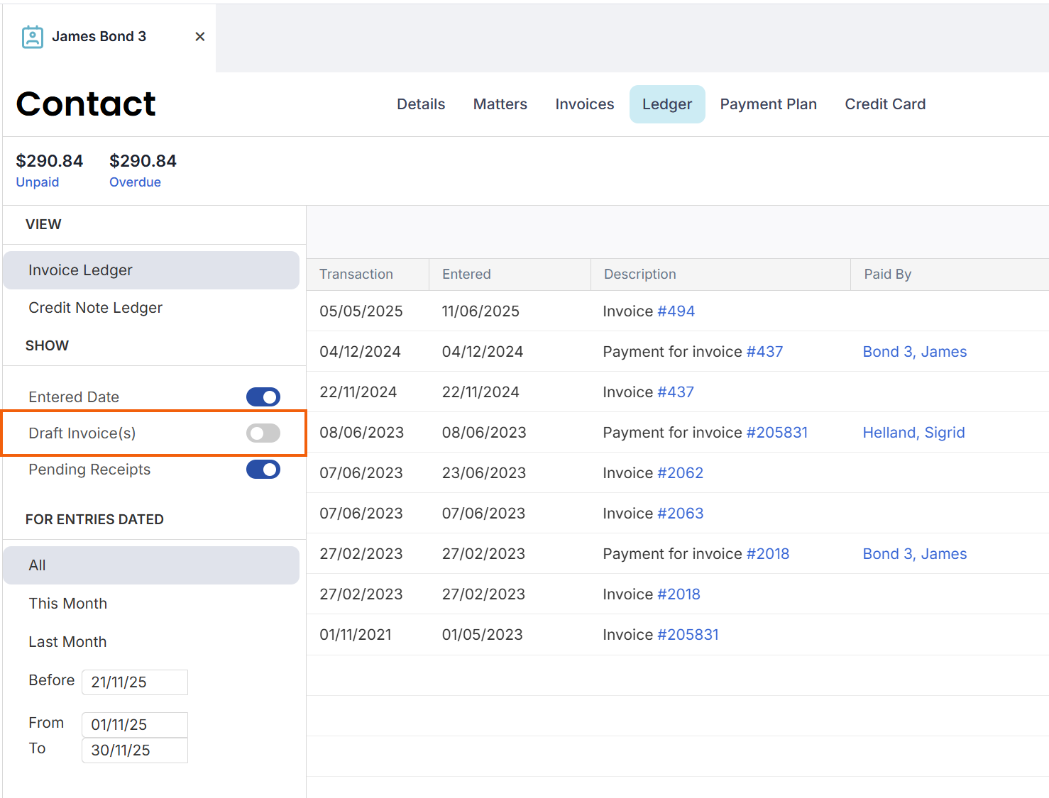 We have made updates to the Invoice Ledger, accessible from the Ledger tab of a client's contact card on the Smokeball Web App:
