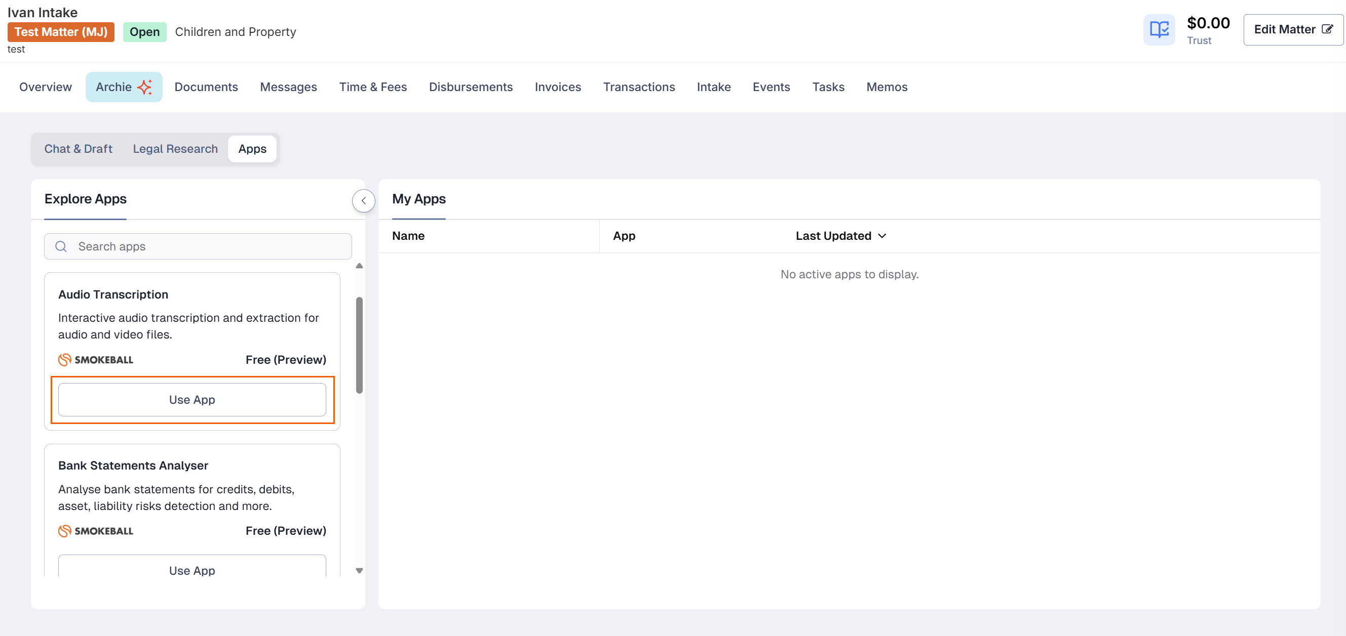 Learn how to use the Audio Transcription Archie App to generate a timestamped and labelled transcript of audio files in the matter.
