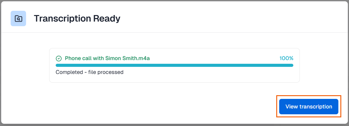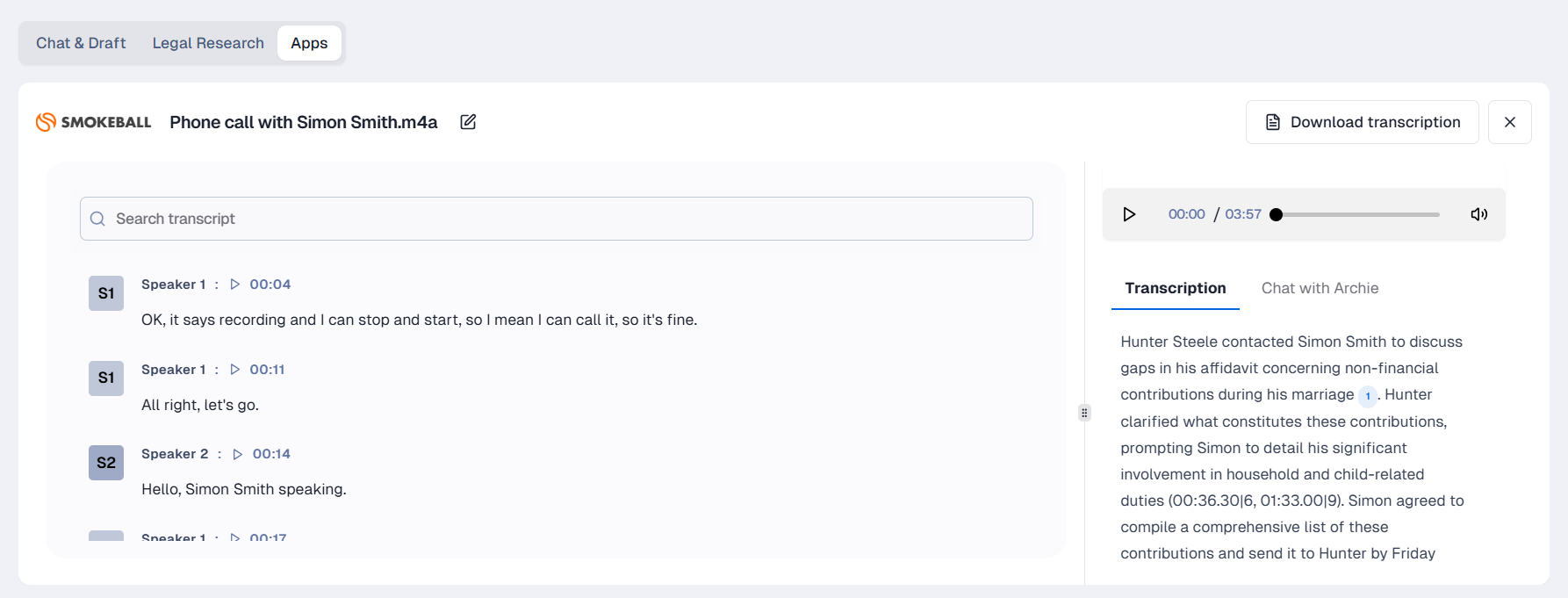 Select Download transcription to save the transcript to the matter as a Word document. The summary will also be included in the transcription file.