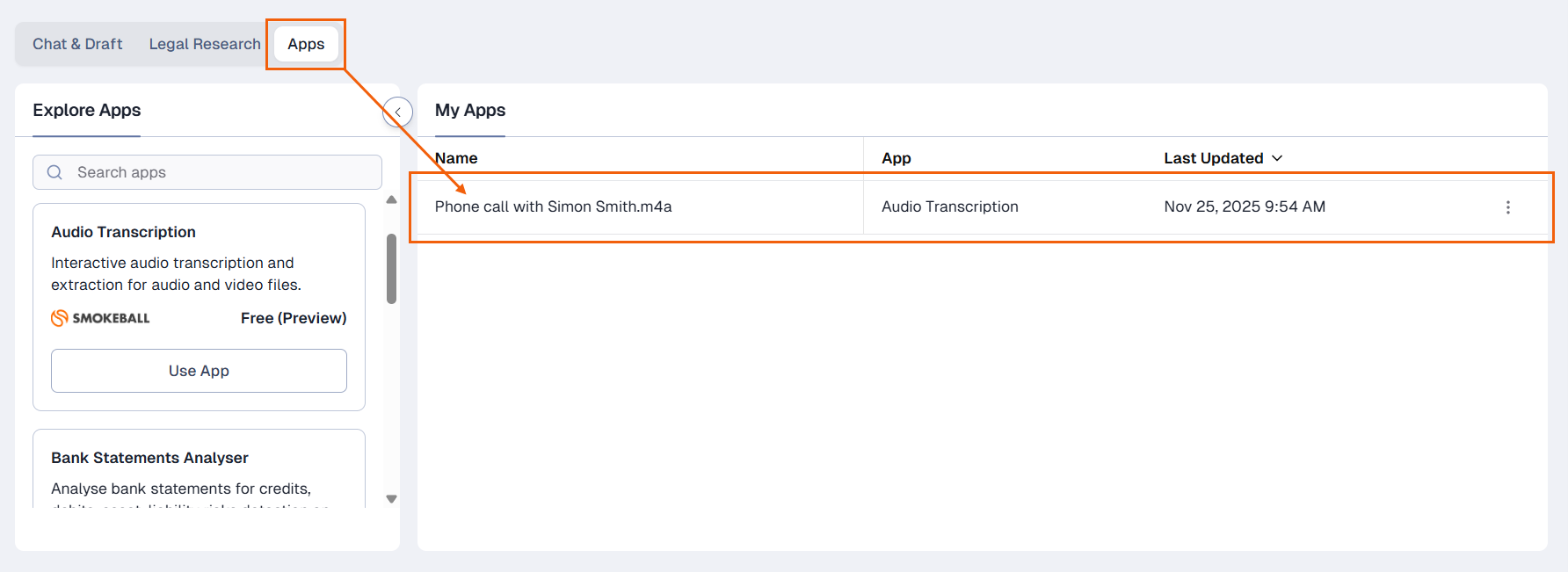 3. Find Audio Transcription under the Explore Apps section on the left menu, then select Use App.