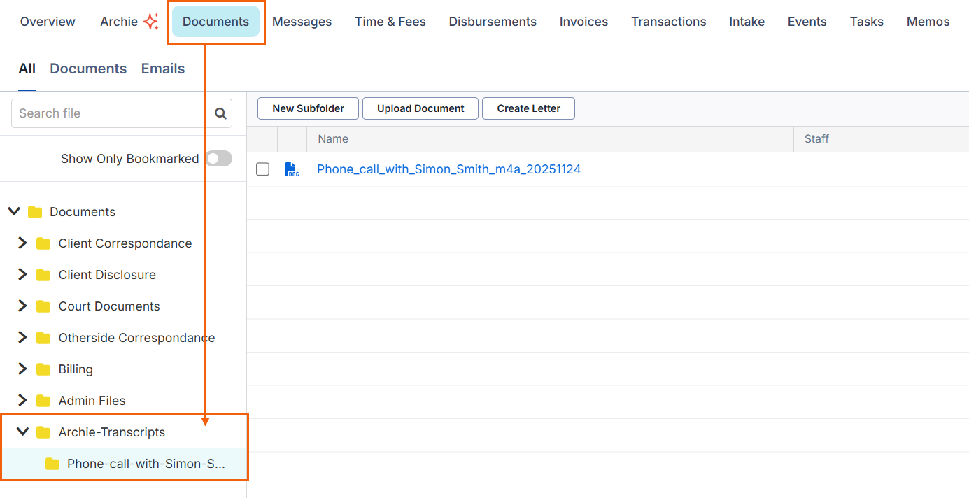 Access downloaded transcripts in the Archie-Transcripts folder of the main Documents list.
