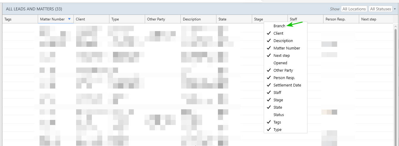 You can also select Branch as a column to display in the Matter List.This is turned off by default; to enable this column, right-click on a column heading and select Branch.